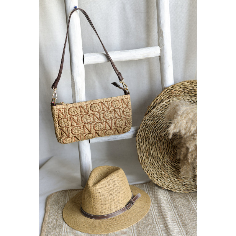 Bolso de formato baguette de rafia con bordado de iniciales de la marca.